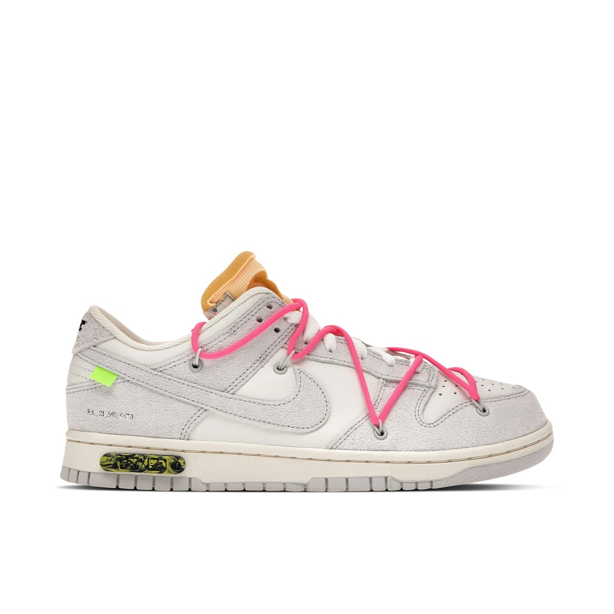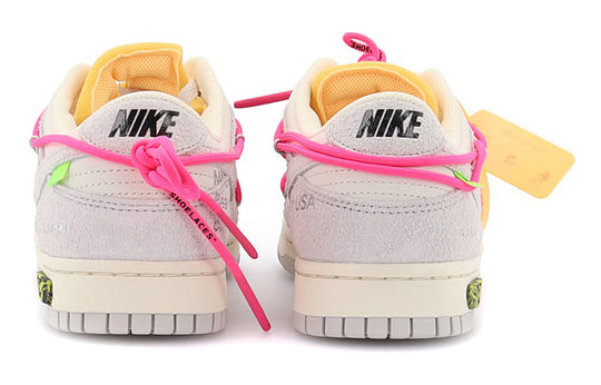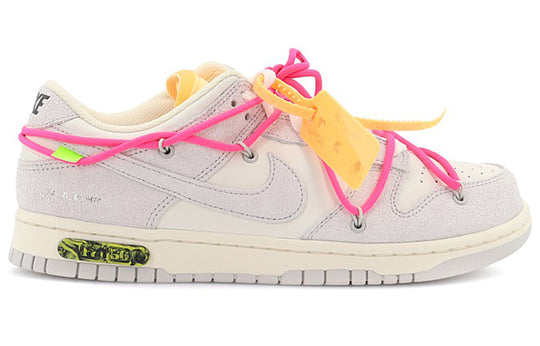 The Nike Dunk Low Off-White Lot 17 features a Sail colorway with a mix of Neutral Grey and Hyper Pink accents. The upper boasts Off-White design elements such as text detailing. The shoe also has a lacing system with white flat laces and Hyper Pink laces. The toe box has perforations for improved ventilation and the outsole is made of rubber.